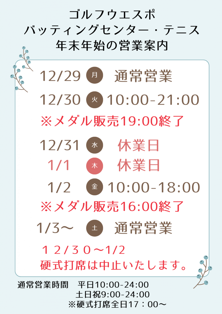 年末年始営業のお知らせ ※12月30日(火)~1月2日(金)まで硬式打席は中止致します