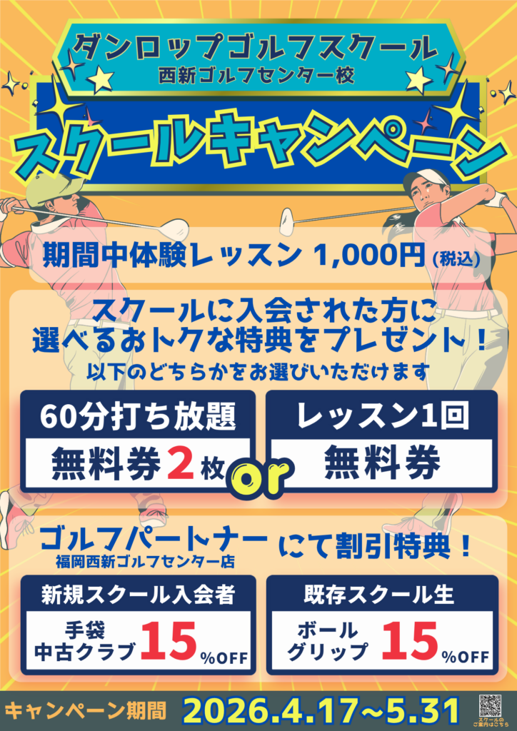 【西新ゴルフ】スクール新規入会キャンペーン 2026年4月23日 西新ゴルフセンター ダンロップゴルフスクール西新ゴルフセンター校 ただいまゴルフレッスンを新たに始めるには 絶好のチャンスです。 まずは体験レッスンのお電話をお待ちしております。